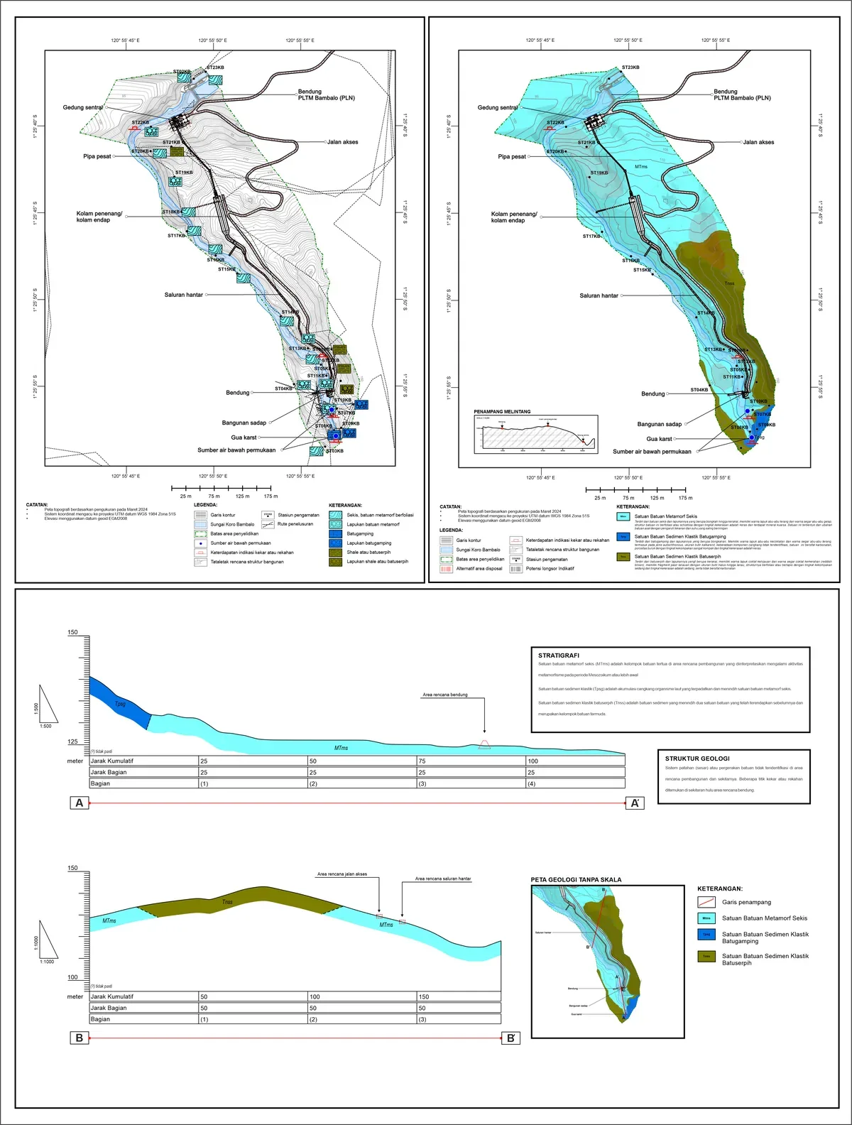 Geomorfologi, sebaran batuan & stratigrafi, pemetaan struktur, potensi longsor; keluaran berupa peta geologi dan penampang.