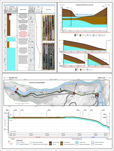 Hydraulic rotary coring; uji SPT, pengambilan sampel terganggu/tidak terganggu; uji permeabilitas; test pit; log bor dan penampang.